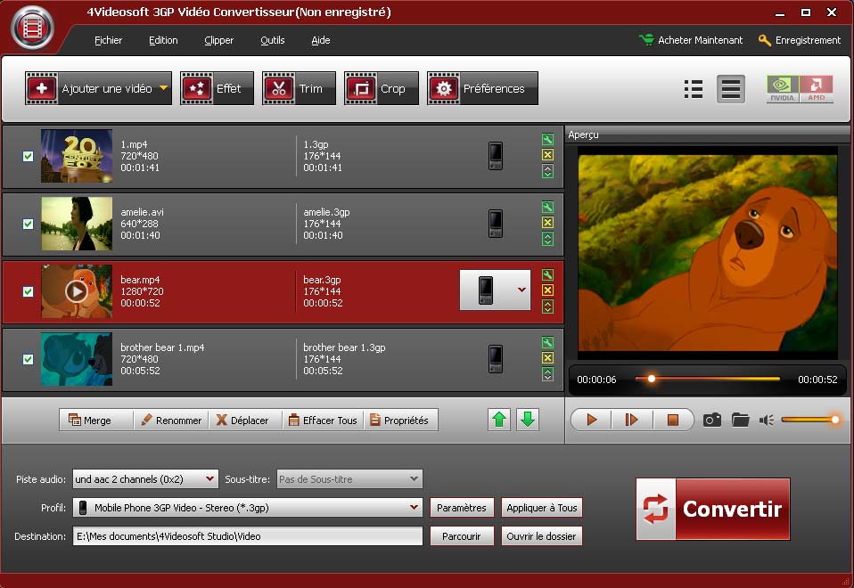 - Convertir tous les formats vidéo en format 3GP, 3G2, MP4, AVI