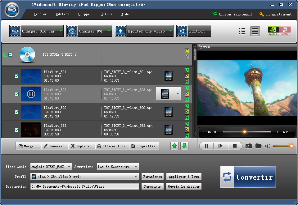 - Blu-ray iPad Ripper possède des fonctions pour convertir Blu-ray fait maison en formats soutenus par iPad et ripper DVD pour être lu sur iPad, transférer aussi les fichiers iPhone.