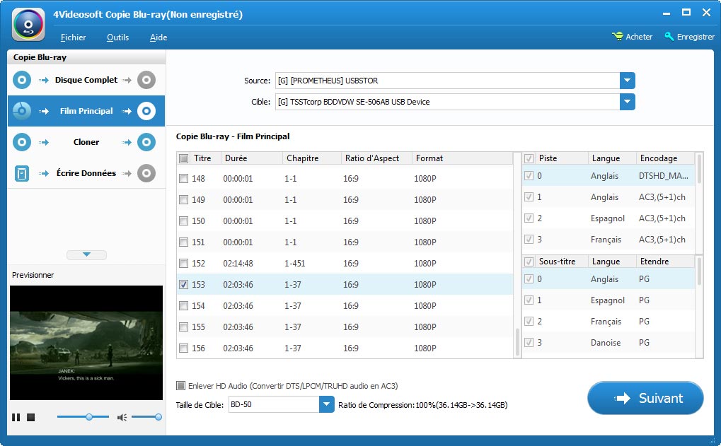 - Quatre modes de copie Blu-ray comme Disque Complet, Film Principal, Cloner, Écrire Données
