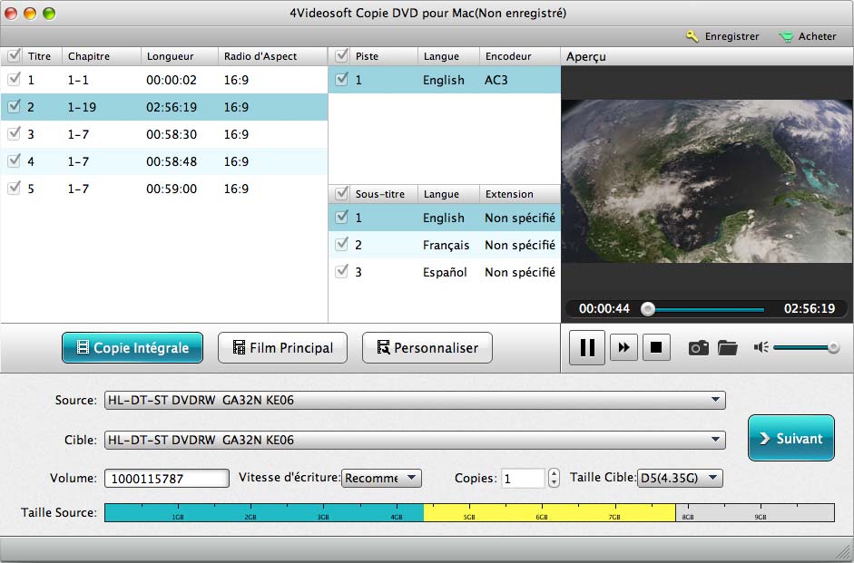- Copier des DVD sur Mac avec le ratio 1:1 ou compresser un DVD-9 vers DVD-5 avec une haute qualité de sortie.