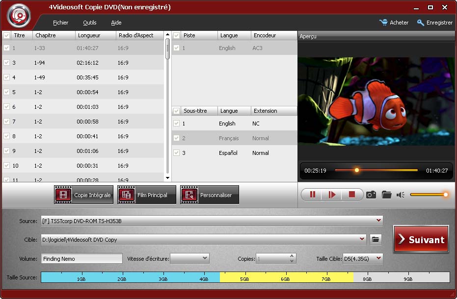 - Copie DVD peut copier DVD vers DVD avec le ratio 1: 1 et compresser DVD-9 vers DVD-5 avec un effet parfait.