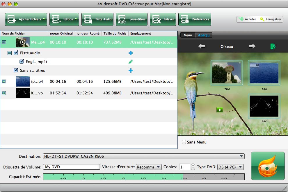 DVD Créateur pour Mac donne la meilleure solution de créer et graver DVD personnalisé avec les fichiers vidéo variés. Vous pouvez utiliser ce Mac DVD Création magnifique à graver disque DVD, dossier DVD ou fichier image ISO avec des vidéos MP4, WMV, AVI, 3GP, VOB, MOV, MTS, MKV, DivX, XviD, MPEG, etc.