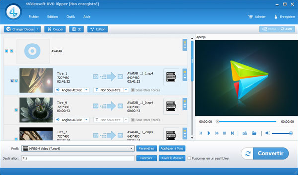 Ce logiciel de conversion DVD vous fournit des fonctions d'édition puissantes : effet, clip, découpage, fusionnement, instantané, filigrane, choix de la piste audio et de sous-titres. DVD Ripper est le meilleur DVD ripper pour rip/convertir votre fichier DVD et rend votre DVD compatible avec votre appareil mobile.