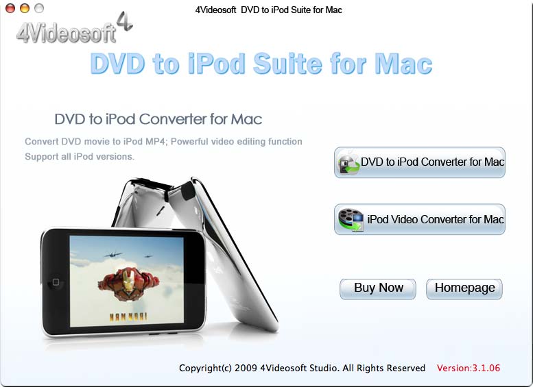 - DVD iPod Suite pour Mac possède la fonction forte pour convertir le film et DVD en iPod MP4, et plus les fonctions d’édition.