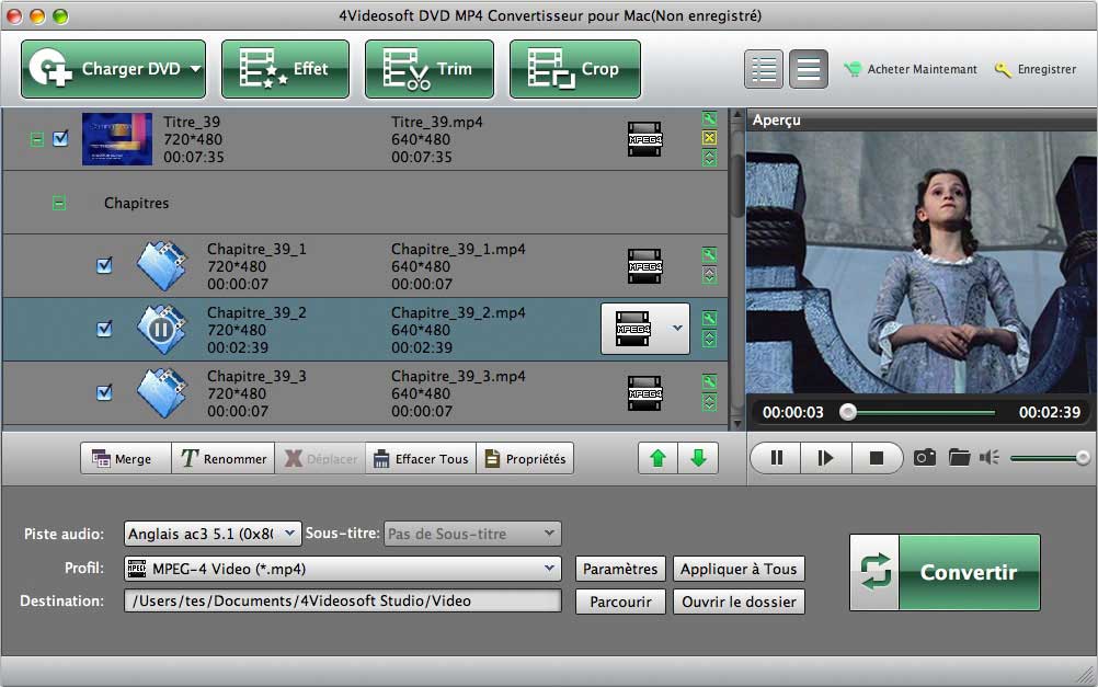 DVD MP4 Convertisseur pour Mac, Mac Convertisseur DVD MP4 parfait pour les utilisateurs de Mac, offre la meilleure solution pour convertir DVD en MP4 sur Mac pour tous les lecteurs MP4. Il peut également être utilisé pour convertir DVD en MP3, AAC, AIFF, M4A, etc.