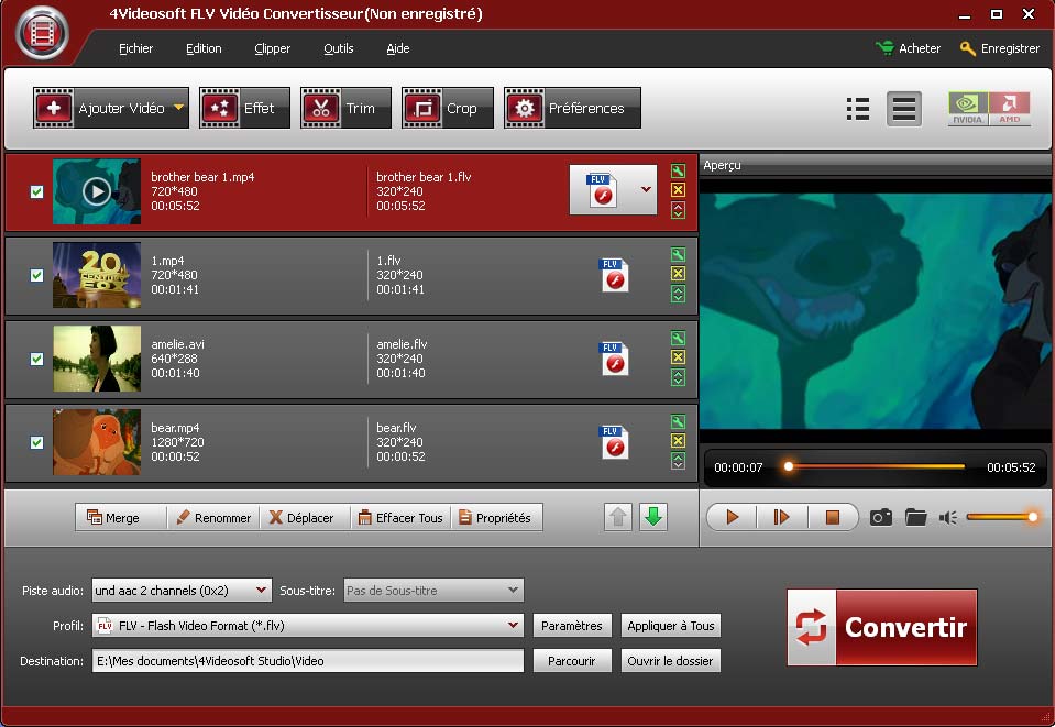 - FLV Vidéo Convertisseur possède les fonctions d'édition et de conversion fortes.