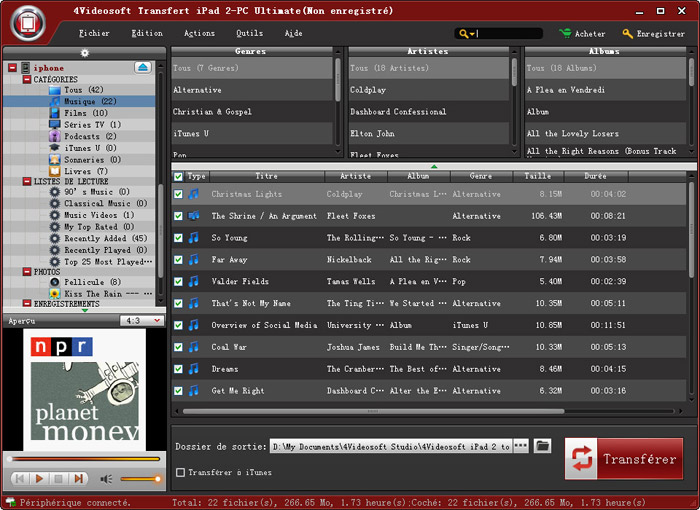 Transfert iPad 2-PC est considéré comme le meilleur outil de transfert iPad 2 à PC pour les utilisateurs. Transférer tous les fichiers de votre iPad 2, y compris musiques, films, images, sonneries, pellicule, mémos vocaux, camera shot. Avec Transfert iPad 2- C Ultimate, vous pouvez aussi transférer série TV, podcast, iTunes U, ePub, PDF, audio livres, photos, SMS, Contacts etc. à PC ou à iTunes.
