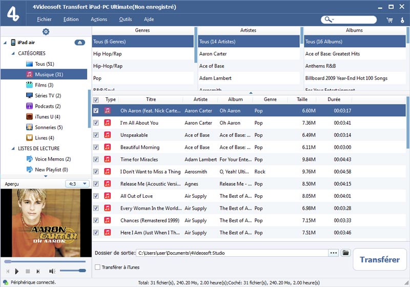 Ce Transfert iPad-PC peut traiter votre iPad comme un disque dur portable pour sauvegarder des choses importantes. Seulement quelque clics peuvent terminer le tout transfert: connecter iPad, choisir chansons/films, et exporter à PC, c'est tout.