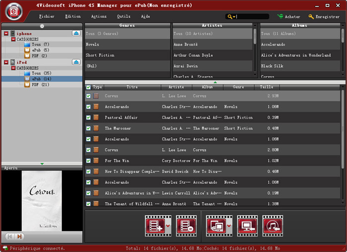 - 4Videospft iPhone 4S Manager pour ePub est très facile à utiliser. Ce que vous devez faire, c'est seulement de connecter votre votre iPhone 4S à PC et de choisir les fichiers que vous voulez.