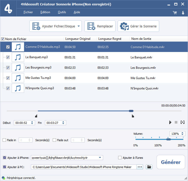De plus, vous pouvez couper le fichier vidéo et audio et choisir la partie à volonté. Ce qui est plus important est que vous pouvez créer une sonnerie m4r sans iTunes. C'est un logiciel pratique et facile à utiliser.