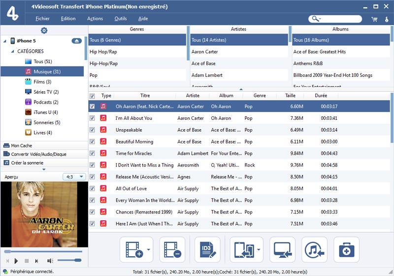 Transfert iPhone Platinum est un logiciel professionnel de transfert iPhone, qui peut transférer les fichiers d'iPhone, y compris Musique/Films/Images/Séries TV/Podcast/iTunes U/eBooks/Pellicule/Sonnerie/SMS/Contacts/Mémos Vocaux/Camera shot à PC. Ce Transfert iPhone est aussi capable de transférer les fichiers de vidéo/audio/image de PC à votre iPhone pour les jouir partout.