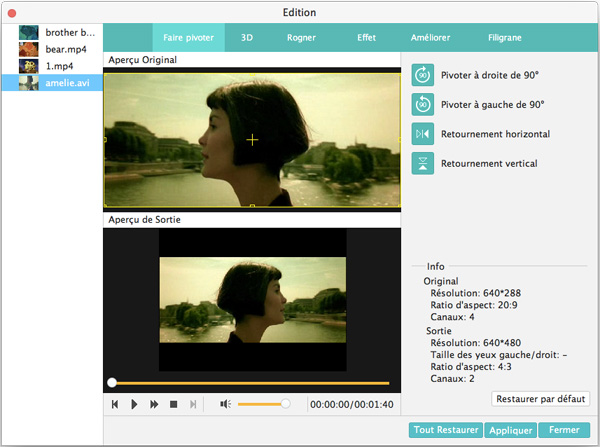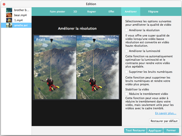 J'aime ce logiciel Video Enhancement. Il me permet de faire pivoter ma vidéo au mauvais sens avec un côté correct. L'image floue et somble dans la vidéo devient claire et brillante. Vraiment cool. C'est le meilleur Video Enhancement que j'utilise.--Par Jacques
