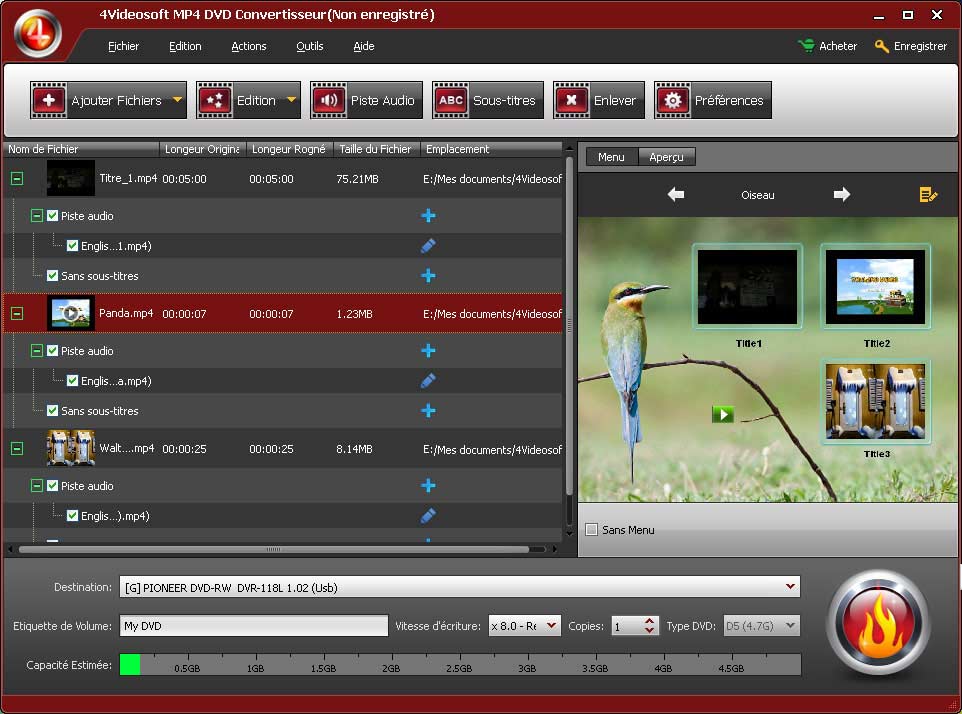 - Avec ce MP4 DVD Convertisseur, vous pouvez aussi brûler directement le disque DVD en insérant un DVD vierge dans le DVD-ROM.