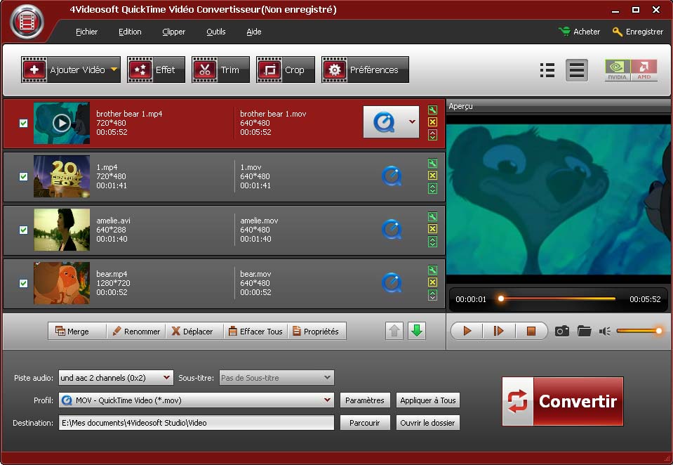 - QuickTime Vidéo Convertisseur possède les fonctions d'édition et de conversion fortes.